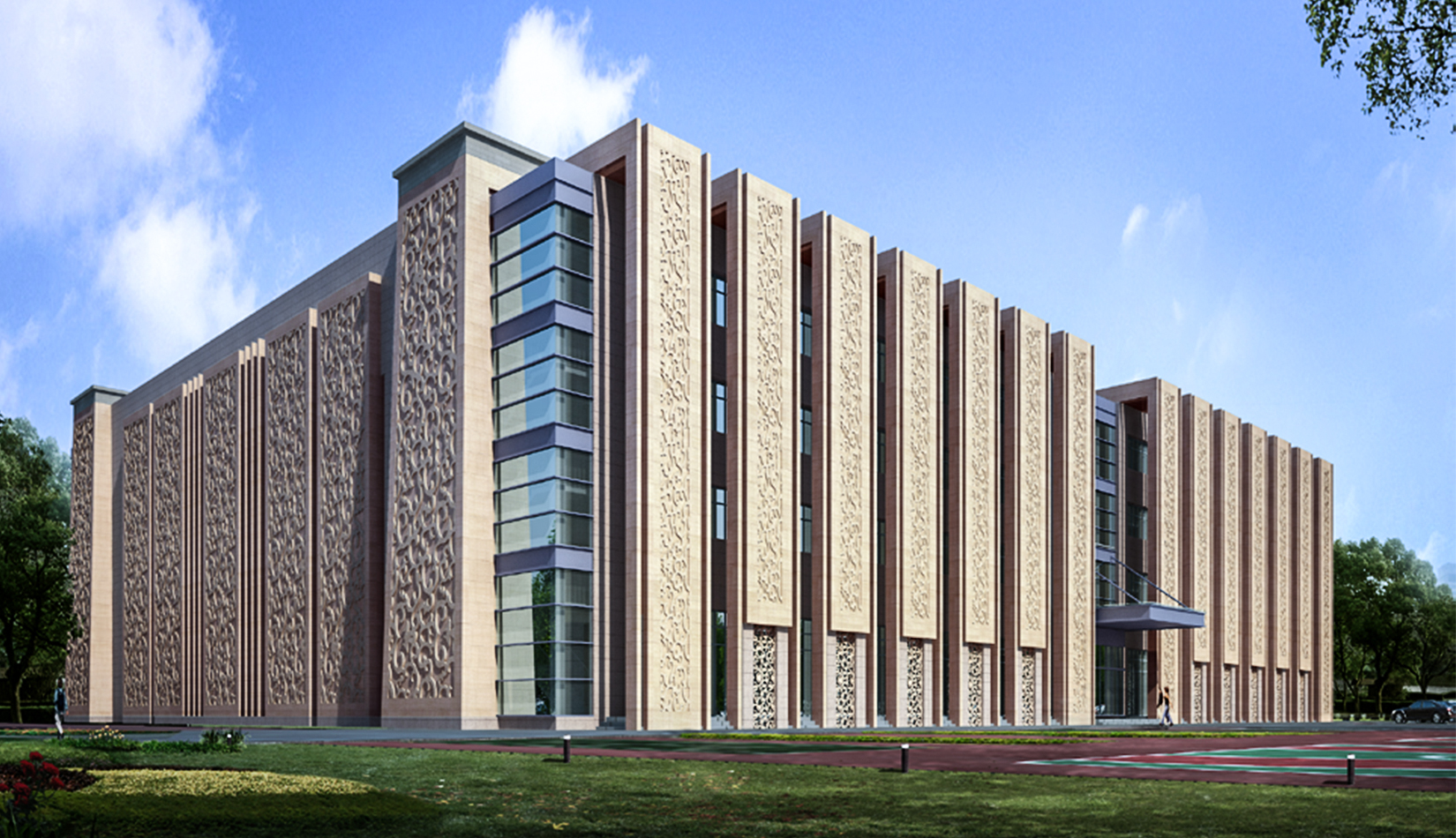 民俗造型、契丹浮雕、當?shù)厥?,設(shè)計源于當?shù)匚幕?,歸于時代潮流,簡潔的造型,龐大的體量使其成為莫旗的城市標志性建筑。