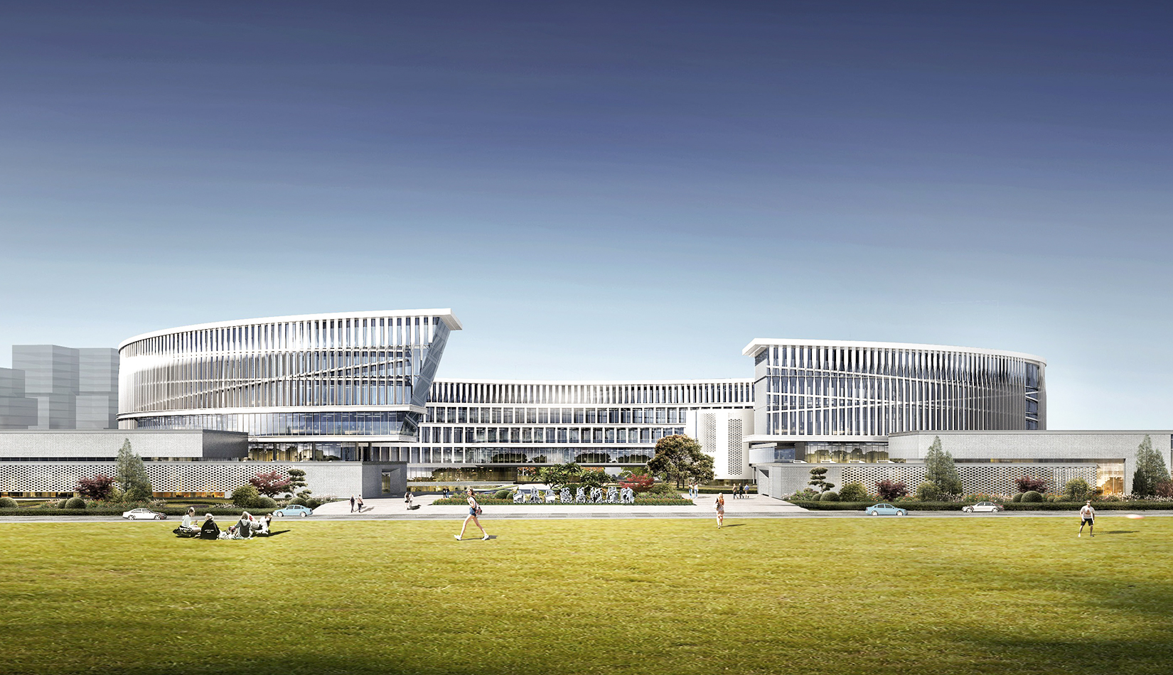 建筑方形體量運用魯班鎖的本質——榫卯結構,進行體塊塑造,將這種天人合一的工匠精神貫穿整個校園。立面材質上,采用石材及具有中國古典韻味的磚幕墻,體現學校厚重的文化底蘊?!棒敯嗑€”交織在教學綜合體所在的圓形體塊上,利用動感流線型的線條,使建筑更具有藝術氣息。
