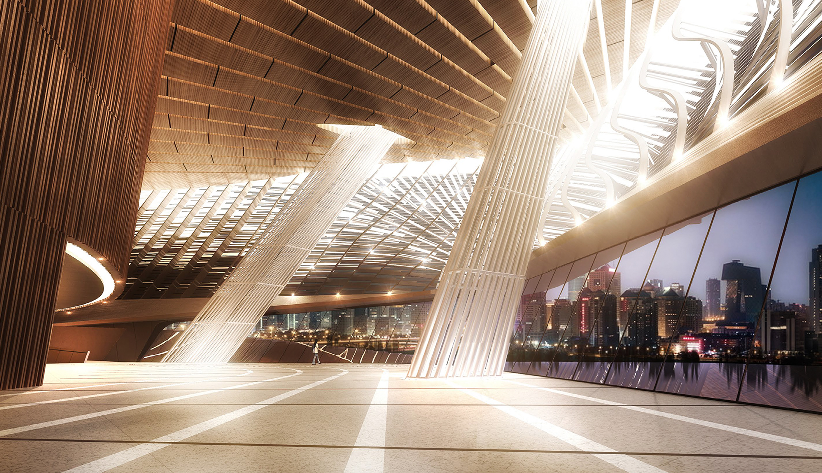 觀眾廳整體空間形態(tài)采用馬蹄形設(shè)計(jì),觀眾廳建聲采用聲學(xué)墻與裝飾墻結(jié)合的方式。延建筑東南部呈“U”型環(huán)繞觀眾廳布置,觀眾二層、三層休息廳設(shè)置吹拔,結(jié)合兩側(cè)連續(xù)坡道,構(gòu)成游走空間,將各層休息廳在空間上相互連通,并結(jié)合建筑表皮,形成莊重、典雅又不失生動的空間體驗(yàn)。