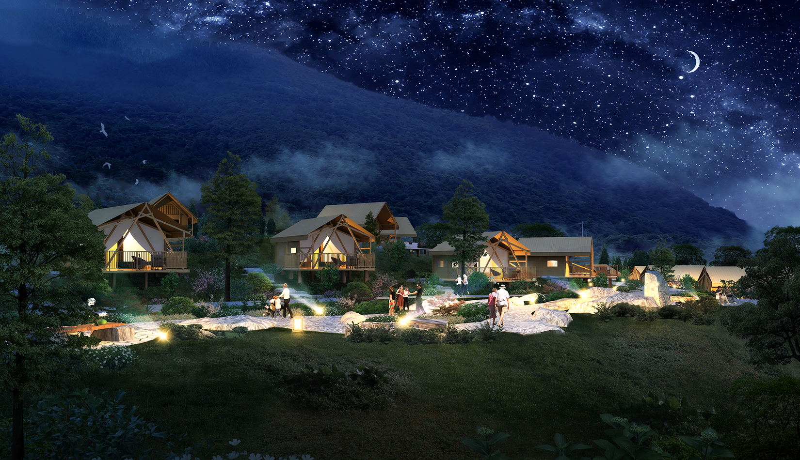 根據(jù)基地的地勢分布及功能需求,空間結(jié)構(gòu)上分為“一帶兩軸三核心五組團”。建筑設(shè)計的五個組團,分別是濱水休閑組團、水畔風(fēng)光帳篷組團、高端養(yǎng)心帳篷組團、中心服務(wù)組團及山居野趣帳篷組團??头坎糠植捎脦づ穸燃傥莸姆绞?,凸顯野奢度假的浪漫形式。
