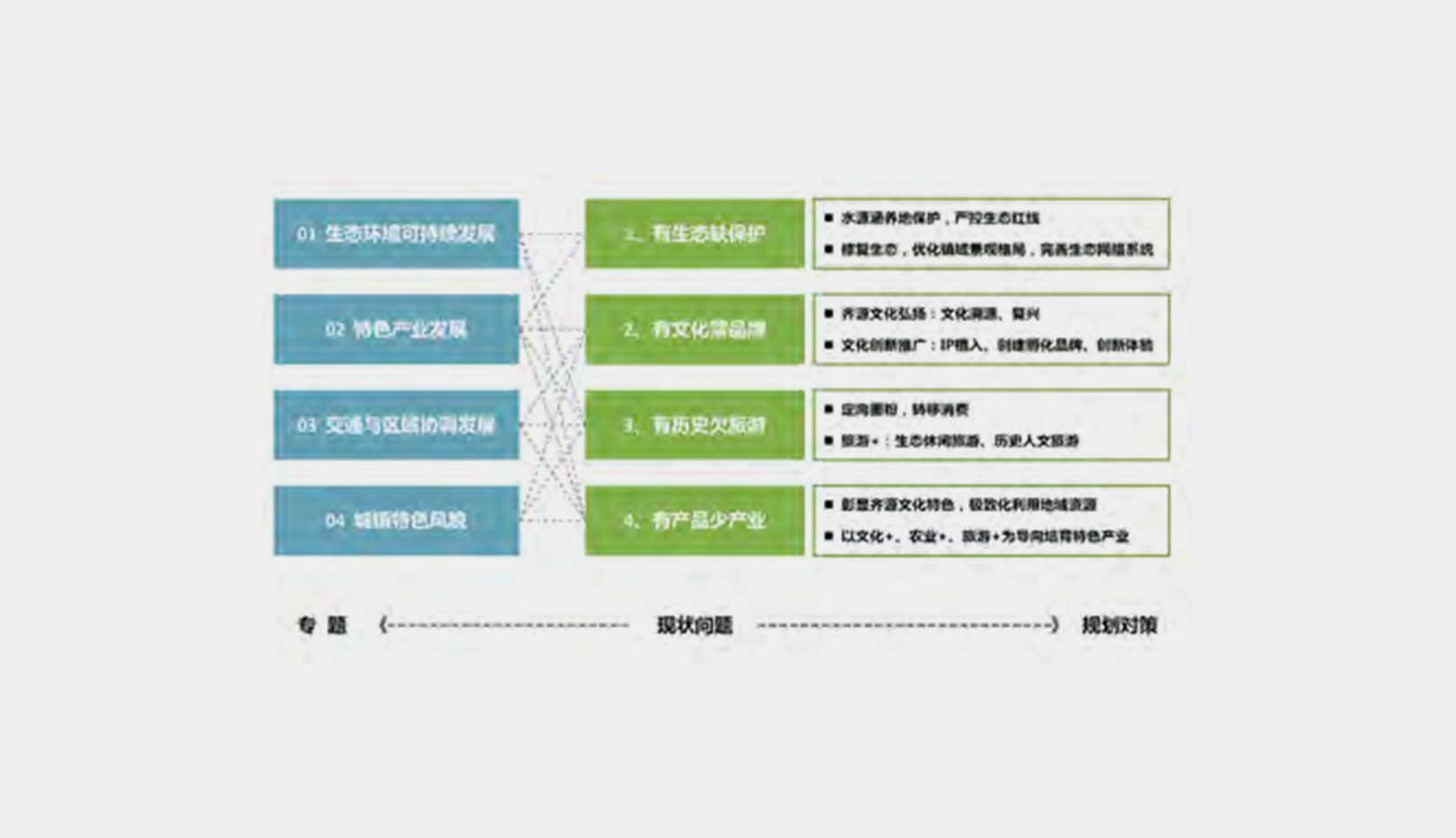 發(fā)展策略: 生態(tài)環(huán)境可持續(xù)發(fā)展、齊源文化復(fù)興、基礎(chǔ)產(chǎn)業(yè)提升、基礎(chǔ)設(shè)施完善、公共服務(wù)提質(zhì)特色產(chǎn)業(yè)體系: 凸顯營(yíng)丘齊源文化特色,轉(zhuǎn)化、極致化利用地域特色資源,以”文化+“、”農(nóng)業(yè)+“、”旅游+”為特色產(chǎn)業(yè)培育導(dǎo)向,完善、提升產(chǎn)業(yè)鏈價(jià)值鏈,構(gòu)建一個(gè)特色鮮明、主題明確的特色產(chǎn)業(yè)體系。