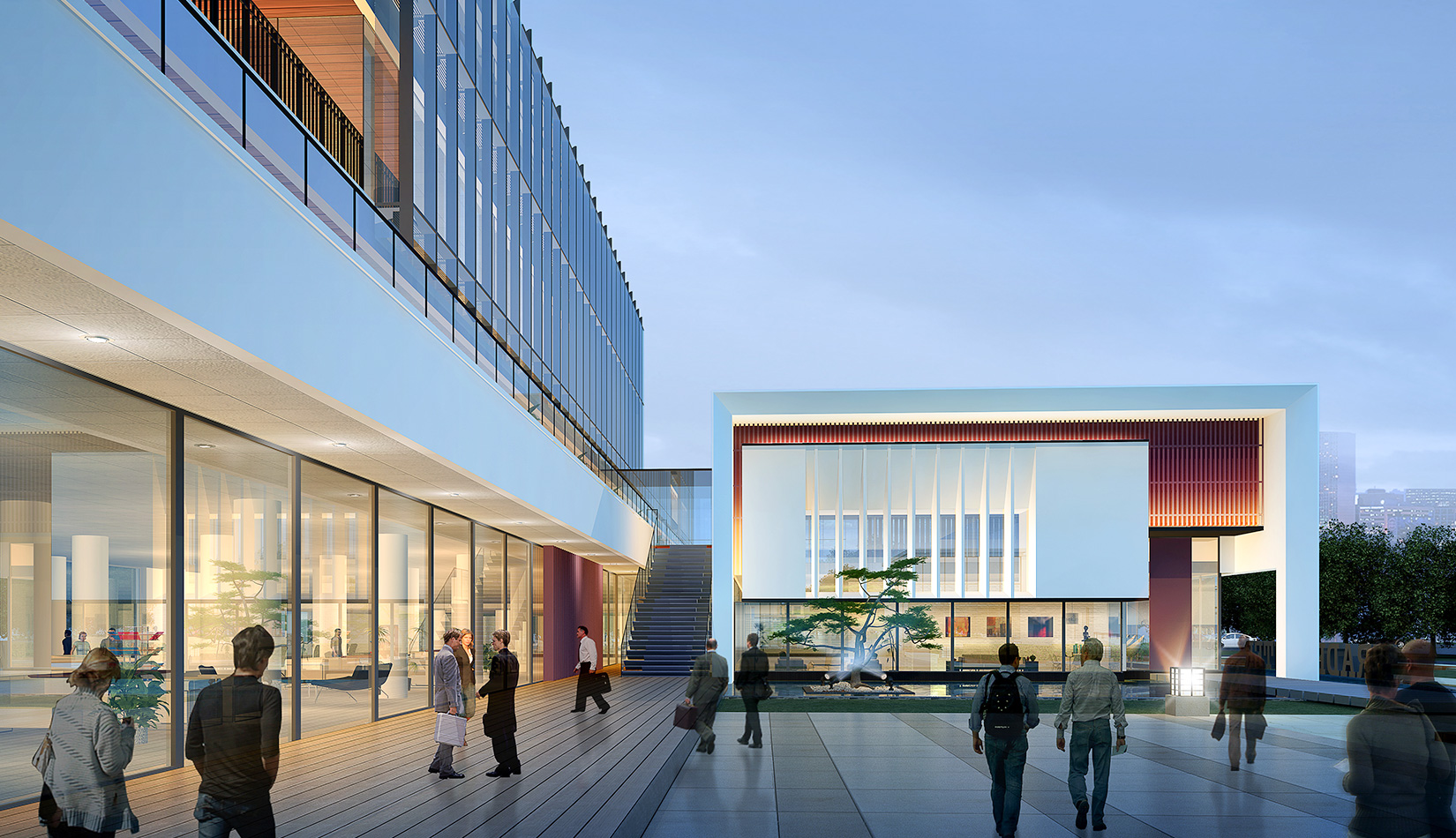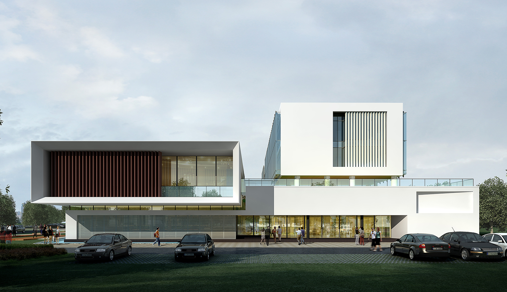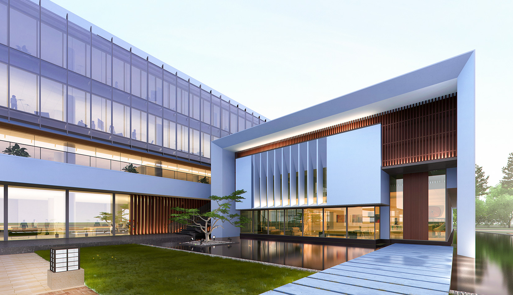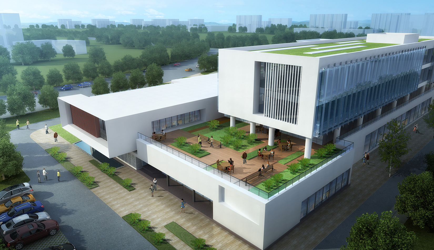 作為中韓貿(mào)易合作區(qū)一期啟動(dòng)區(qū)的重點(diǎn)項(xiàng)目,其承擔(dān)著對(duì)外展示以及為后續(xù)發(fā)展提供服務(wù)平臺(tái)的功能。因此設(shè)計(jì)力求穩(wěn)重大氣,以4 層的體量打造出地標(biāo)性的建筑。設(shè)計(jì)運(yùn)用簡(jiǎn)潔的外形、寧?kù)o的色彩,外立面以白色涂料和木格柵為主,尊重自然,打造一種平和寧?kù)o的感覺。在空間設(shè)計(jì)上通過共享空間、上人露臺(tái)和一層大平臺(tái),創(chuàng)造出舒適宜人的工作環(huán)境;在技術(shù)上通過地源熱泵、呼吸式幕墻、雨水收集等的應(yīng)用,實(shí)現(xiàn)建筑的綠色節(jié)能環(huán)保。