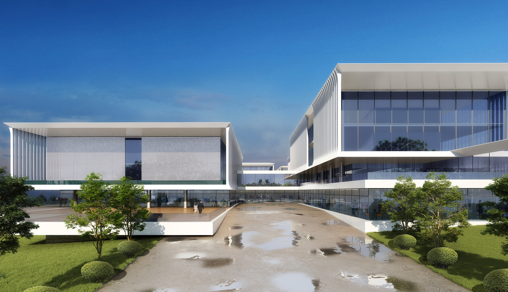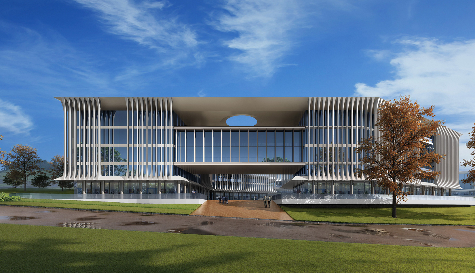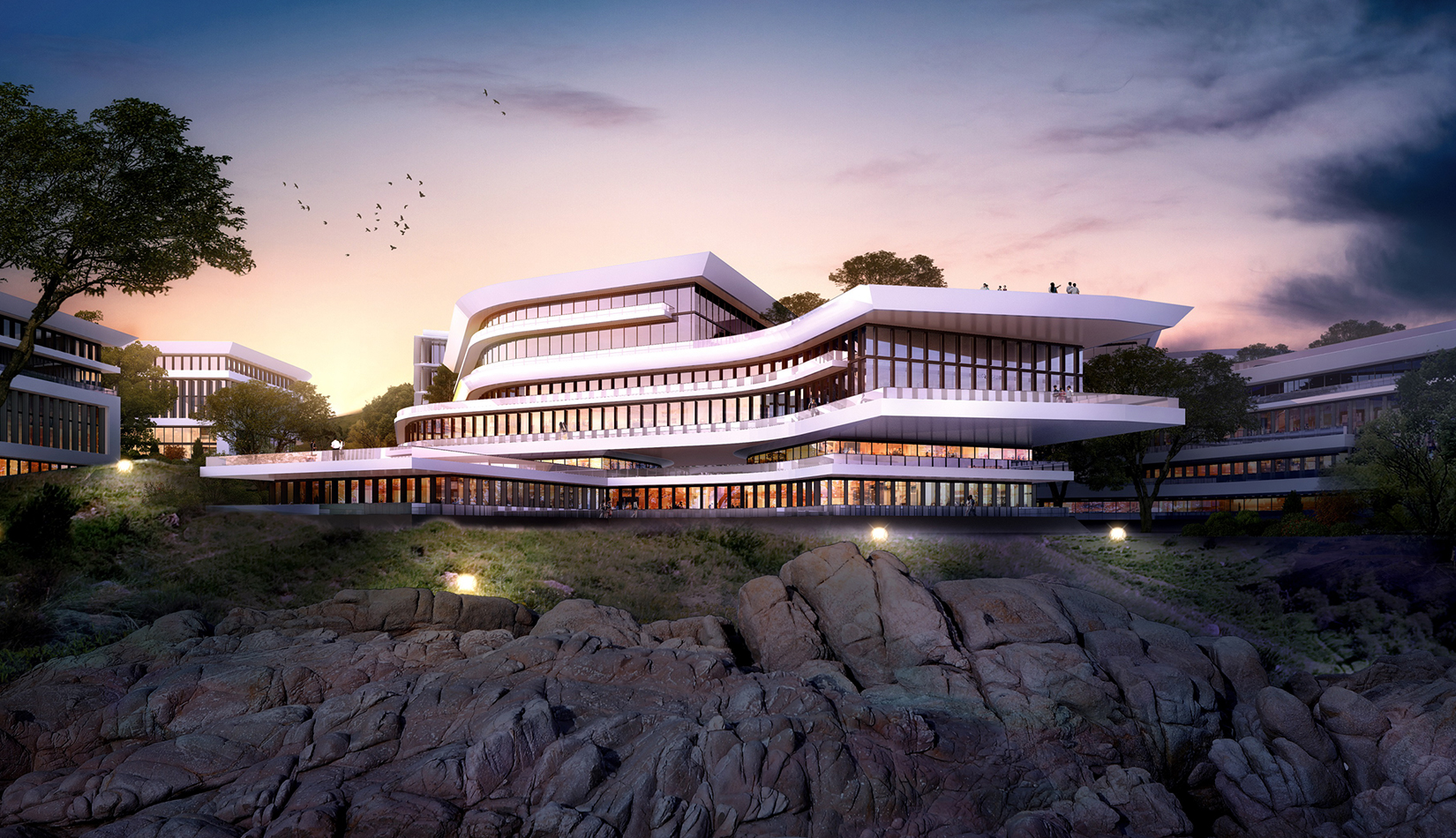 簡潔大氣的豎向橫向劃分,使MECS主樓充滿海洋氣息;白色流線型屋頂順應(yīng)地勢,自由舒展。流線型的體塊靠近海岸線,表達(dá)科研人員的探索精神,并且與地勢相結(jié)合。