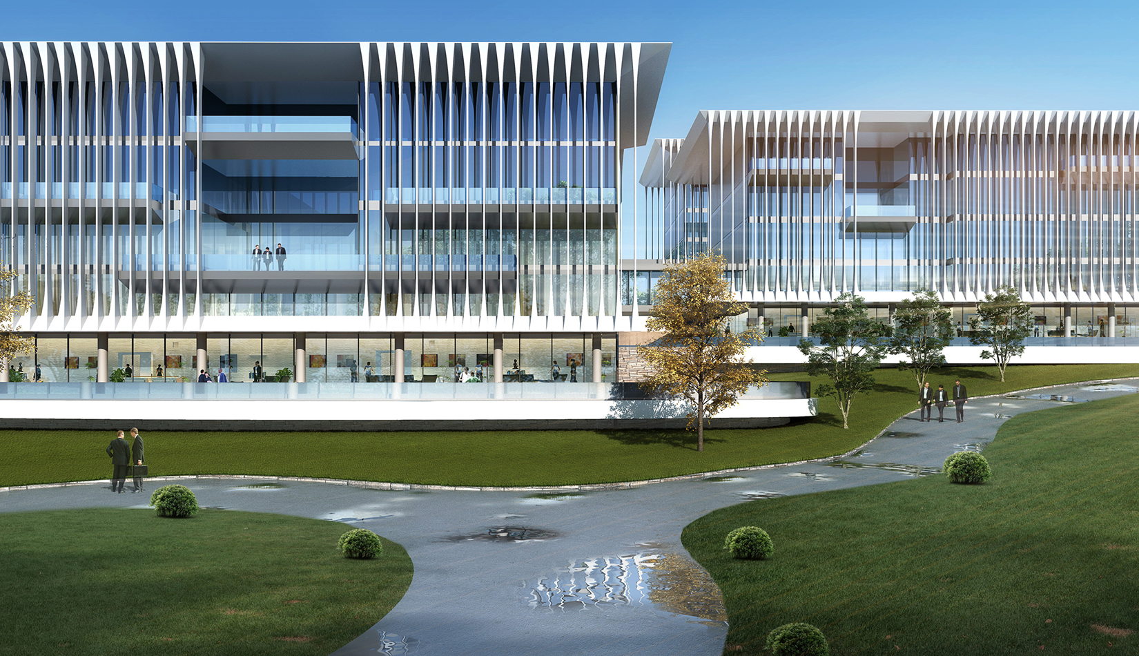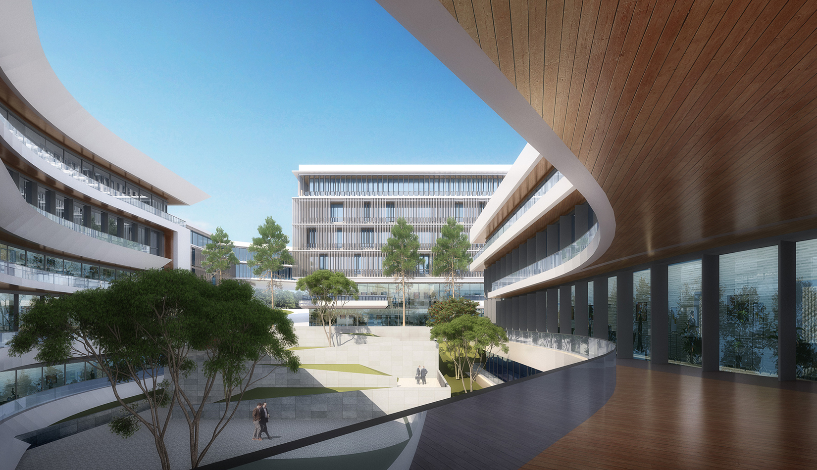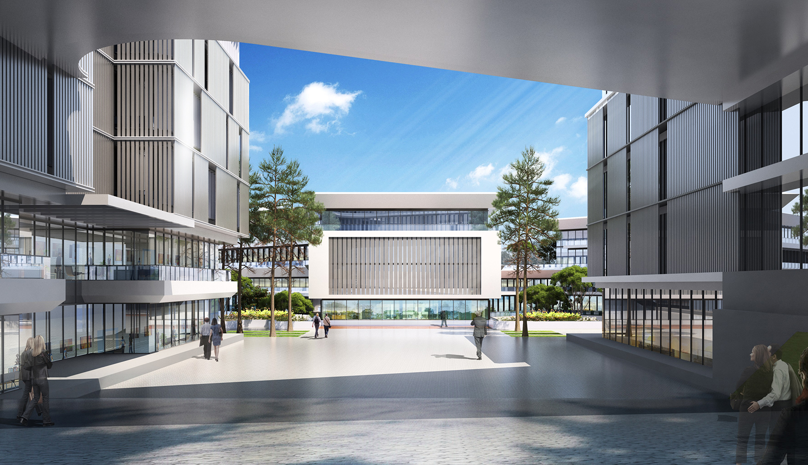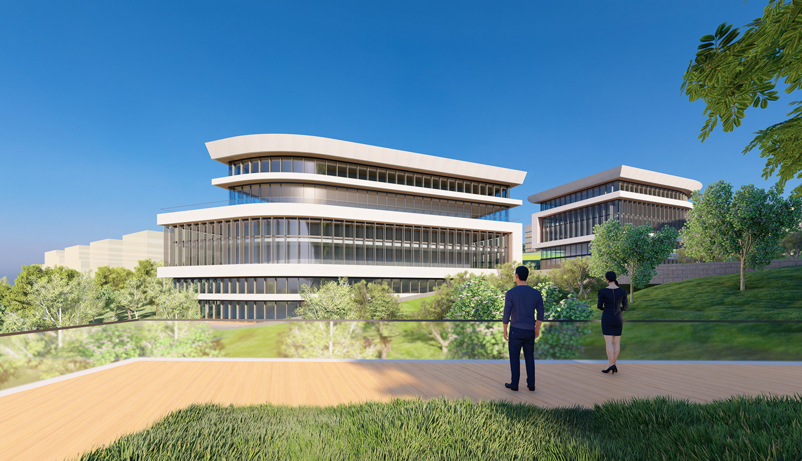 簡潔大氣的豎向橫向劃分,使MECS主樓充滿海洋氣息;白色流線型屋頂順應(yīng)地勢,自由舒展。流線型的體塊靠近海岸線,表達(dá)科研人員的探索精神,并且與地勢相結(jié)合。
