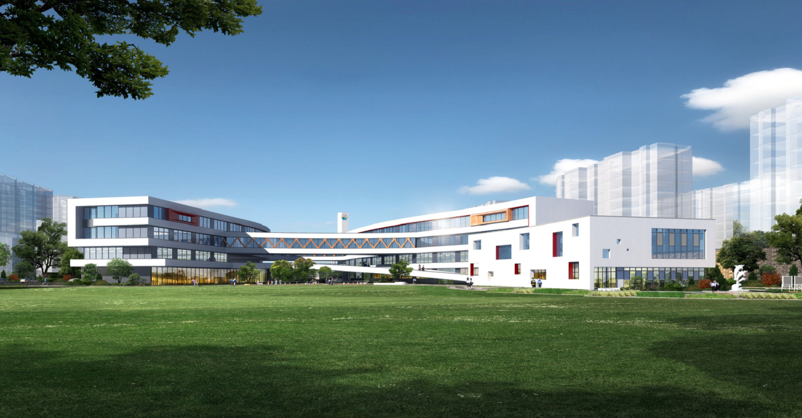 校園規(guī)劃采用曲線手法,營造流水姿態(tài),將東側(cè)山脈與西側(cè)河流連接在一起。設(shè)計(jì)現(xiàn)代化“山水”校園,使學(xué)生在自然中成長。營造活水發(fā)源的“源頭”意境,寓意教育為人類文化長河的源頭,呼應(yīng)學(xué)校“源頭”文化。曲線舒展的形體,整體采用白色色調(diào),局部以紅黃色進(jìn)行點(diǎn)綴,風(fēng)格純潔又不失活潑。